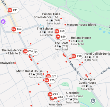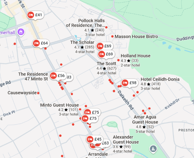 Most of these B&Bs include a full breakfast in their prices with rooms available for as little as £65 per night per room with doubles, twins and family rooms all available. To get to the venue from here is about 5 minutes on a bus (to Surgeons Hall bus stop) or 20 minutes on foot.